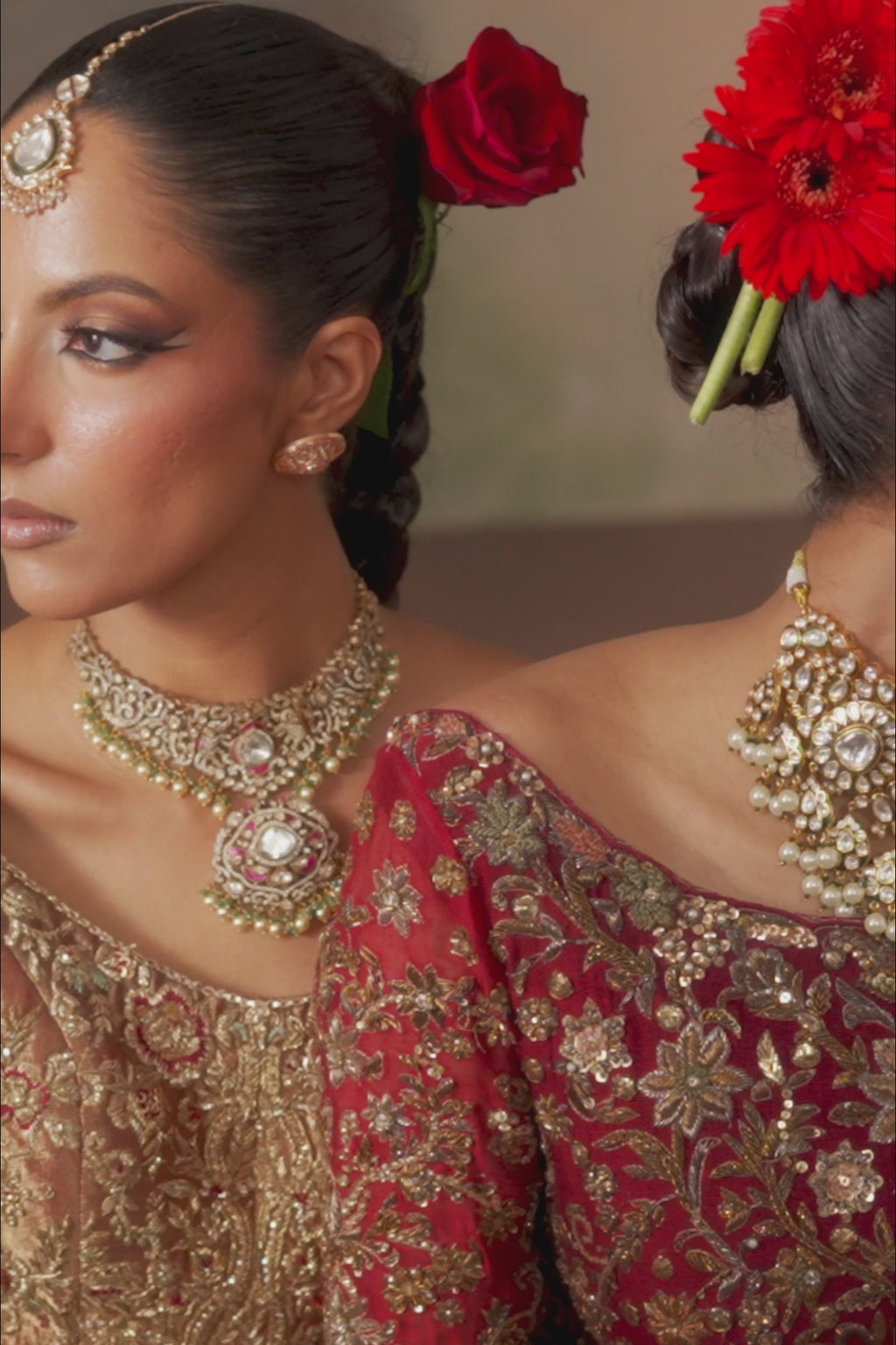 The front-open pishwas, fashioned from ethereal burnt coral tissue, shimmer beautifully under delicate hand embellishments with rich zardozi and resham work.