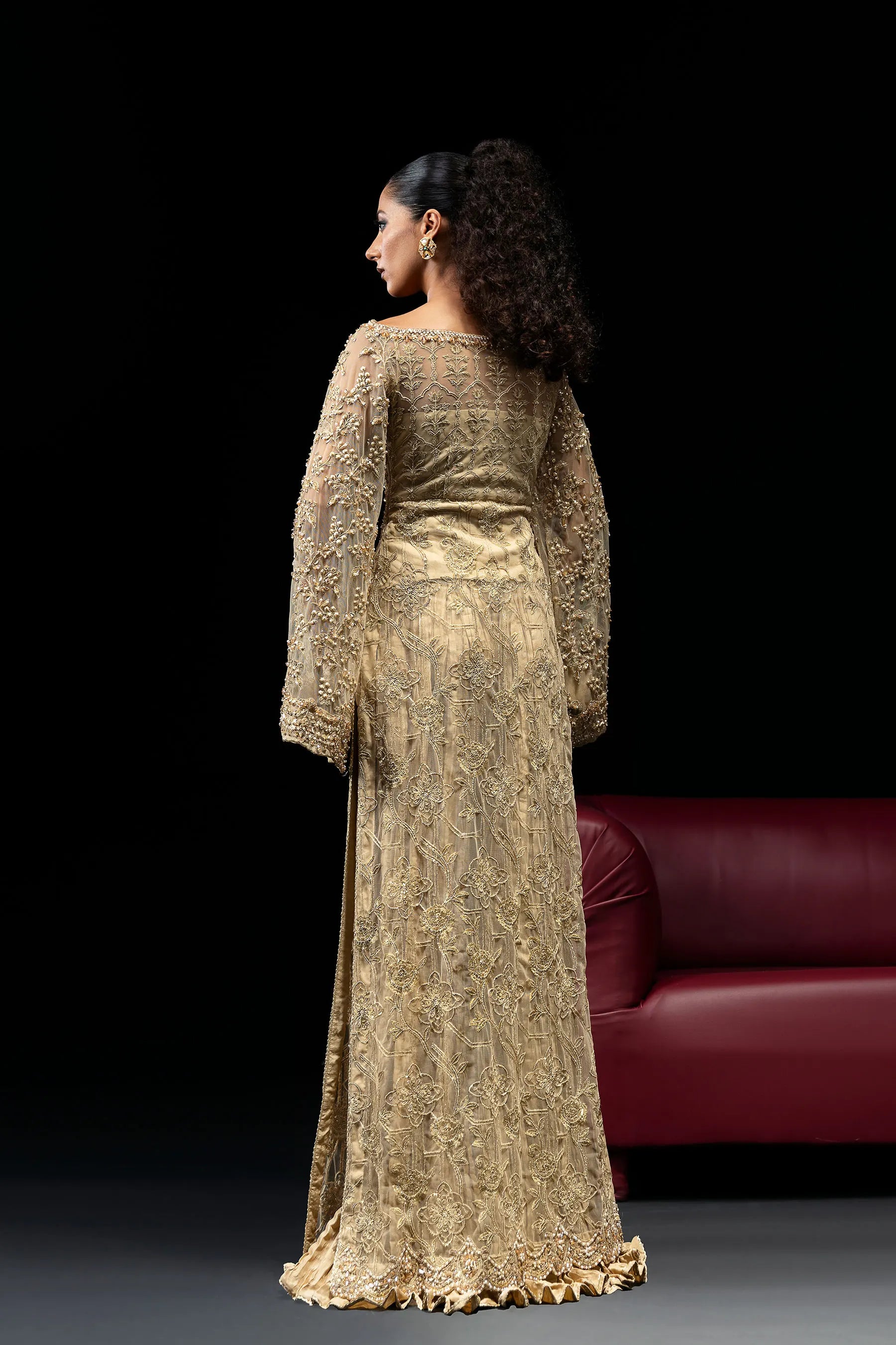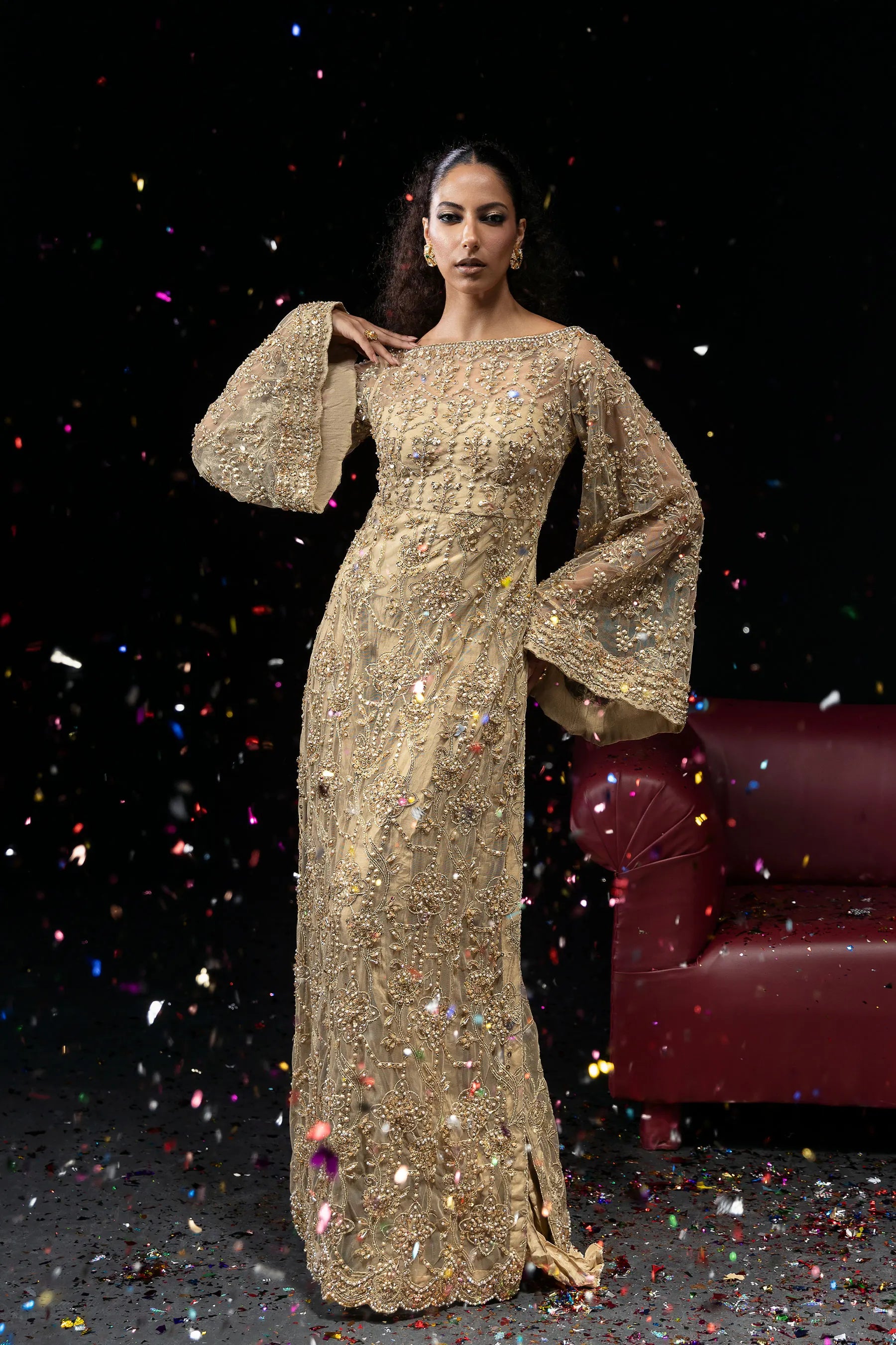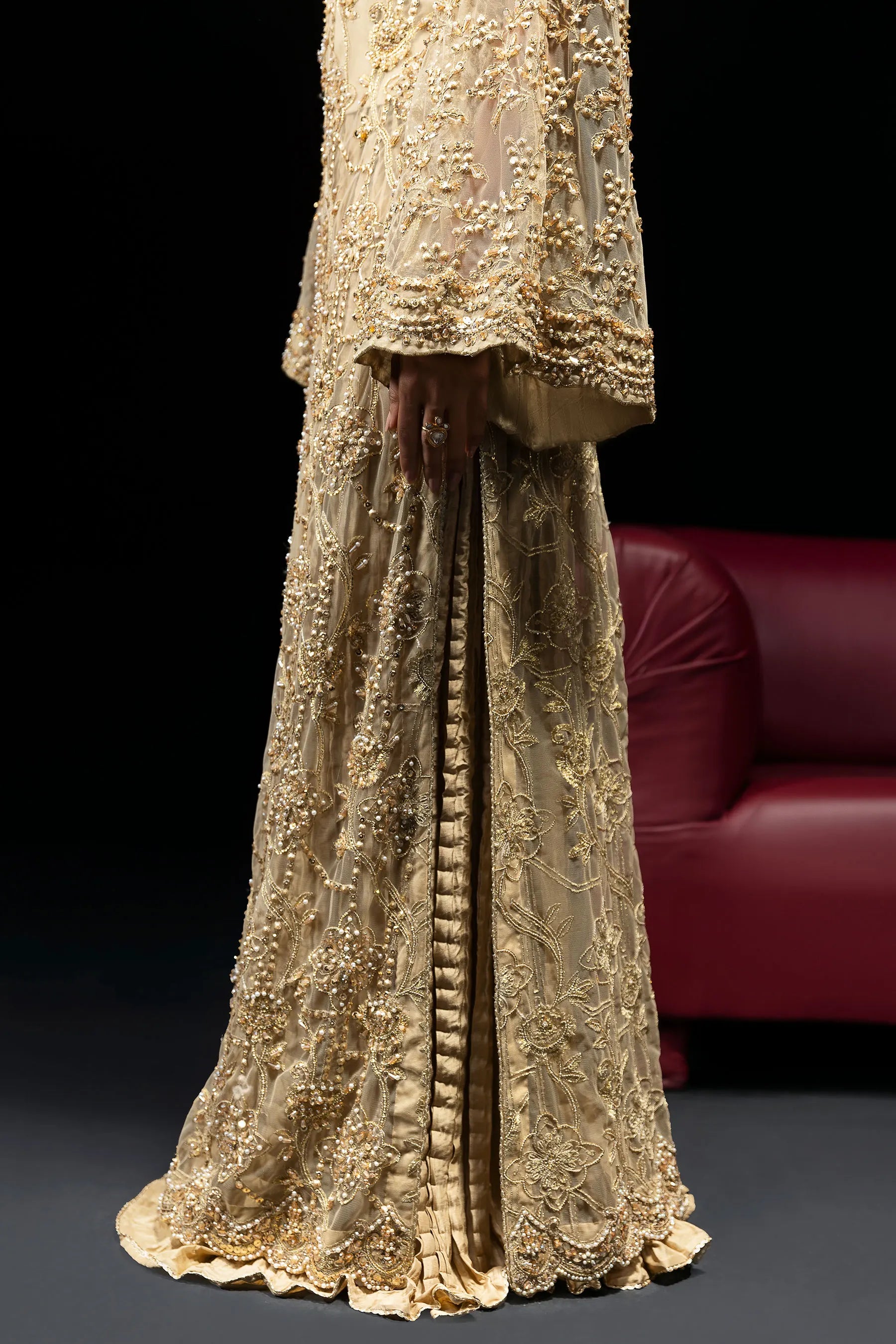 This exquisite floor-length shirt in a soft beige tone showcases elaborate bead and sequin embroidery on a sheer overlay, creating a luxurious effect. Intricate floral and leafy motifs extend across the front, back and flared sleeves. The elegant boat neckline is framed with delicate embellishment, adding a refined finish. The look is completed with crushed wide-leg pants, bringing graceful movement and modern charm to this statement piece from  KARA collection.