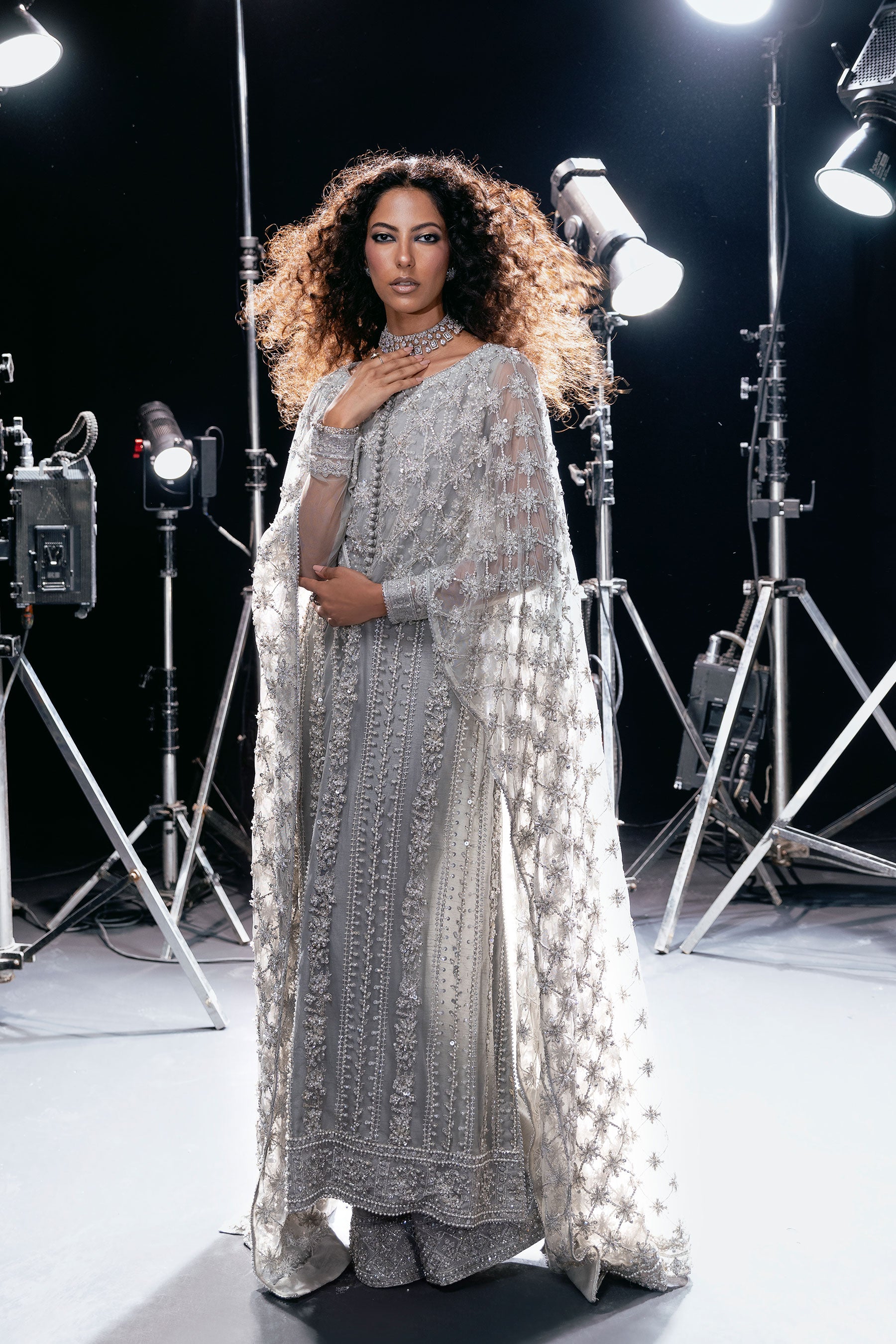 A silver grey ensemble adorned with intricate hand embellishment using crystals, sequins, and thread-work. The flowing silhouette features a cape-style overlay that adds drama and elegance. The delicate floral pattern and textural detailing elevate the overall design.  The outfit is paired with wide-leg pants, richly detailed with ornate embellishment. Dazzling, dramatic, and undeniably show-stopping, a true jewel of the KARA collection.