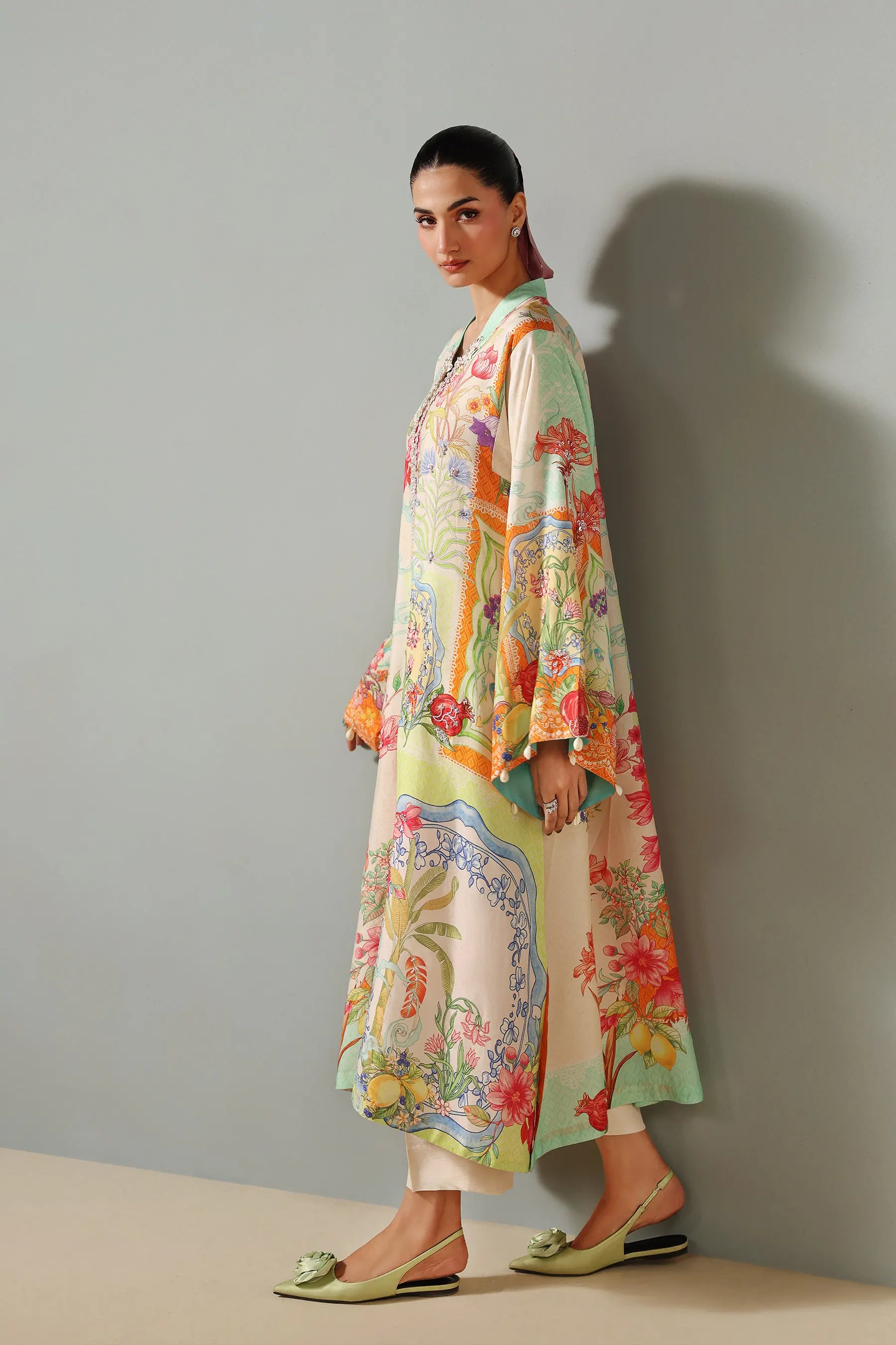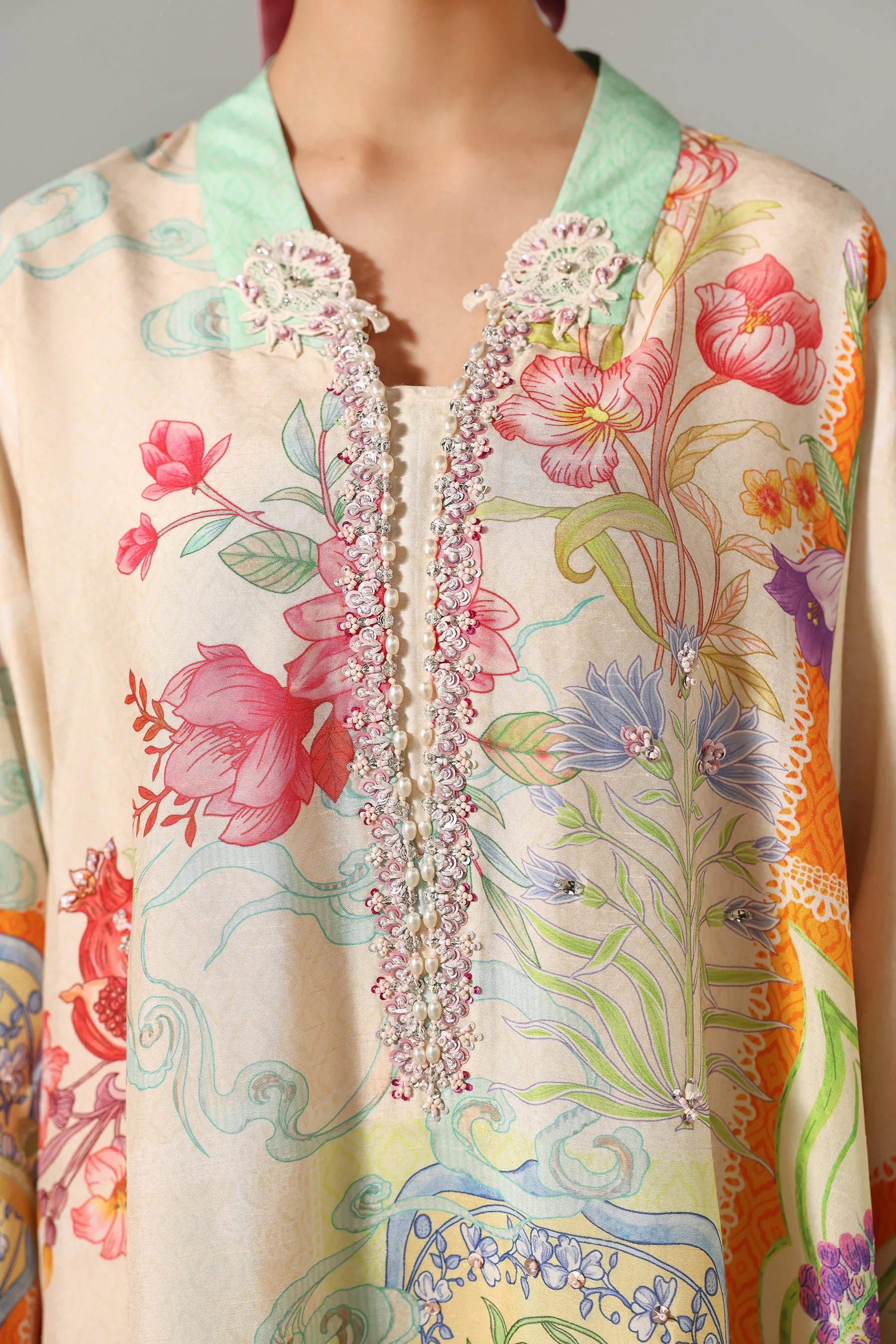 Embrace refined daytime festivity with this elegant ivory ensemble by AMMARA KHAN. This ensemble features a long, relaxed cut shirt with a floral and fruit-inspired print in pastel tones. The neckline is hand-embellished with pearls, and sequins, while the wide sleeves are finished with printed borders and shell drop accents. The outfit includes straight pants and the design offers effortless charm, making it perfect for Eid gatherings and celebratory moments.