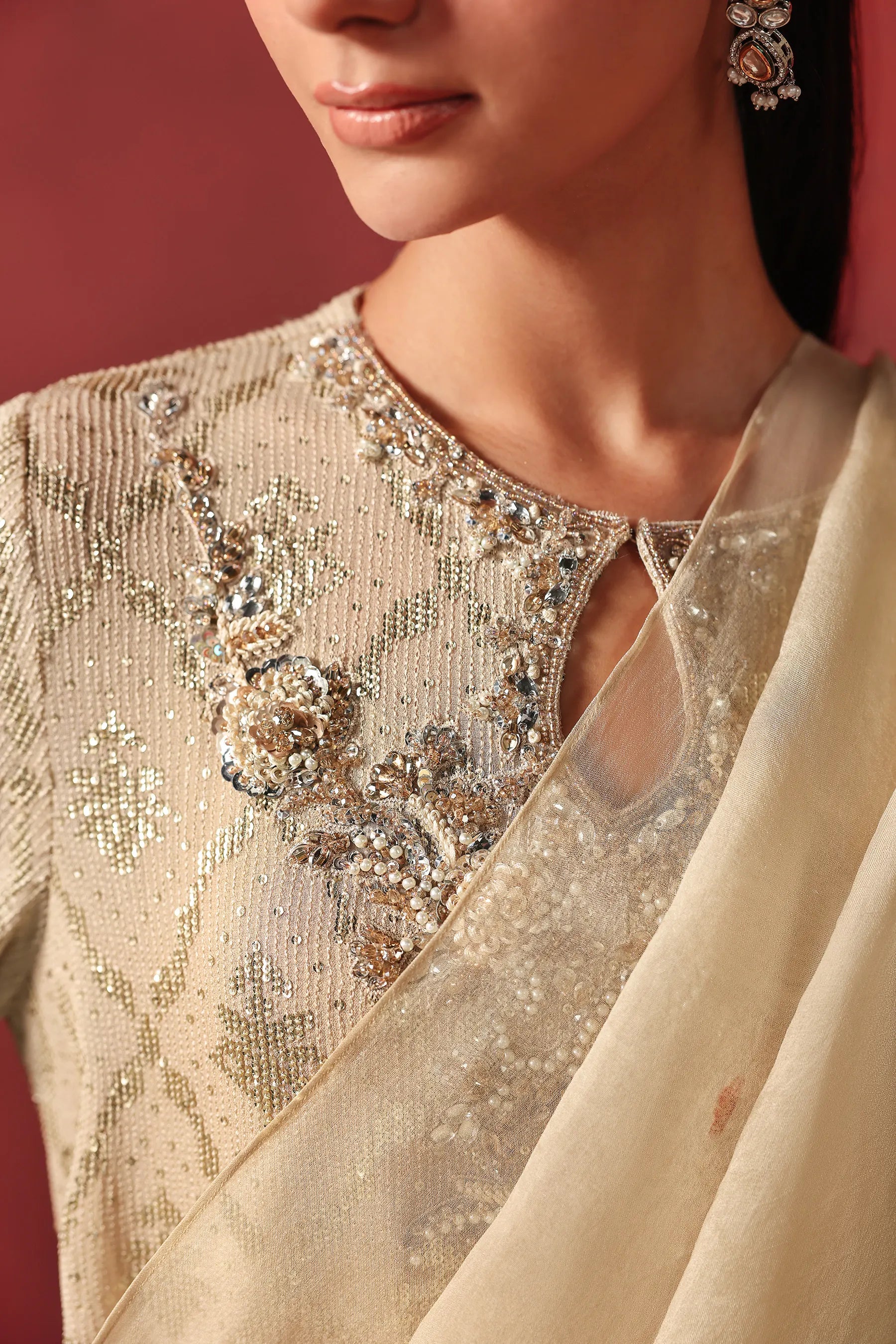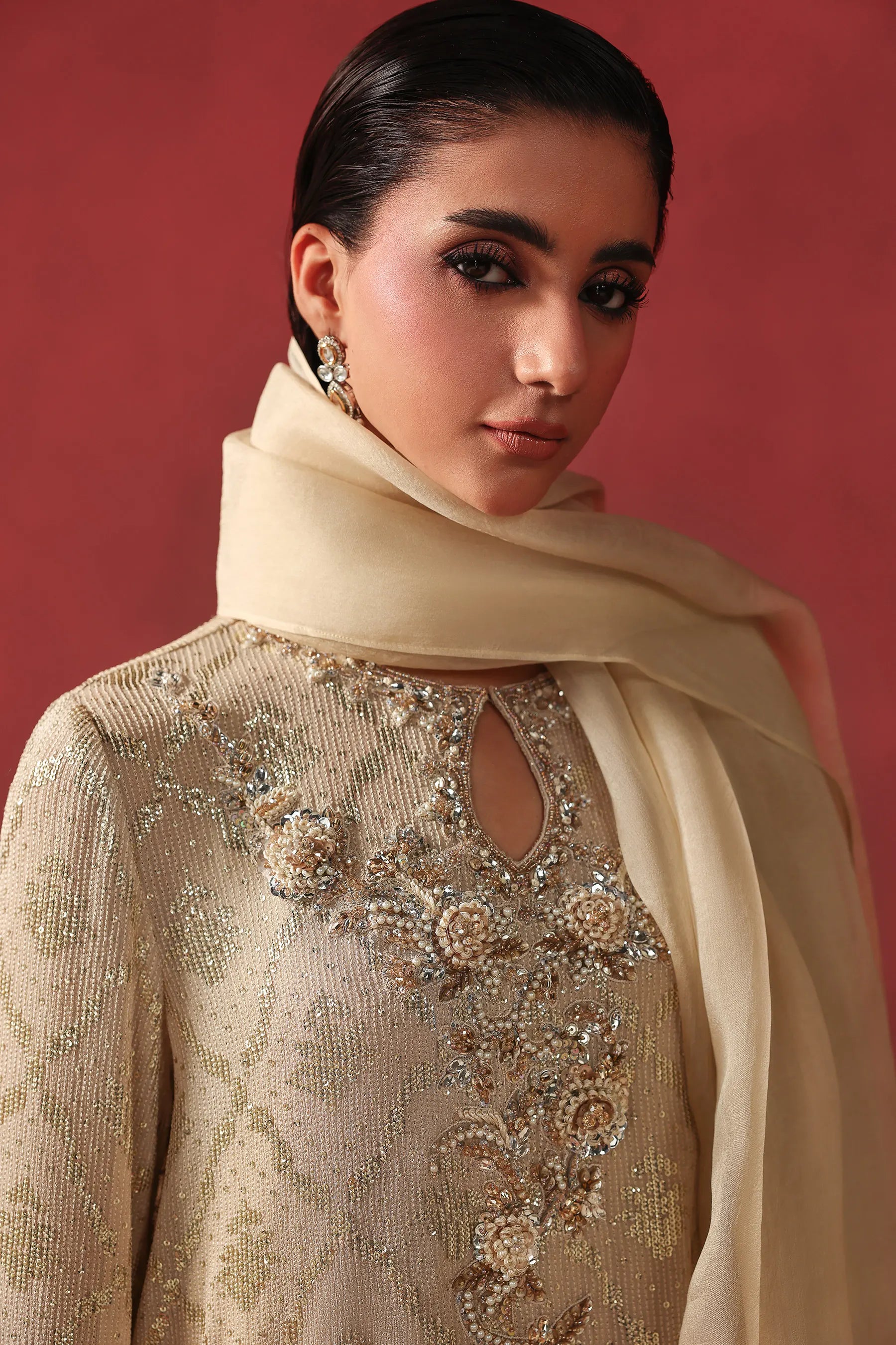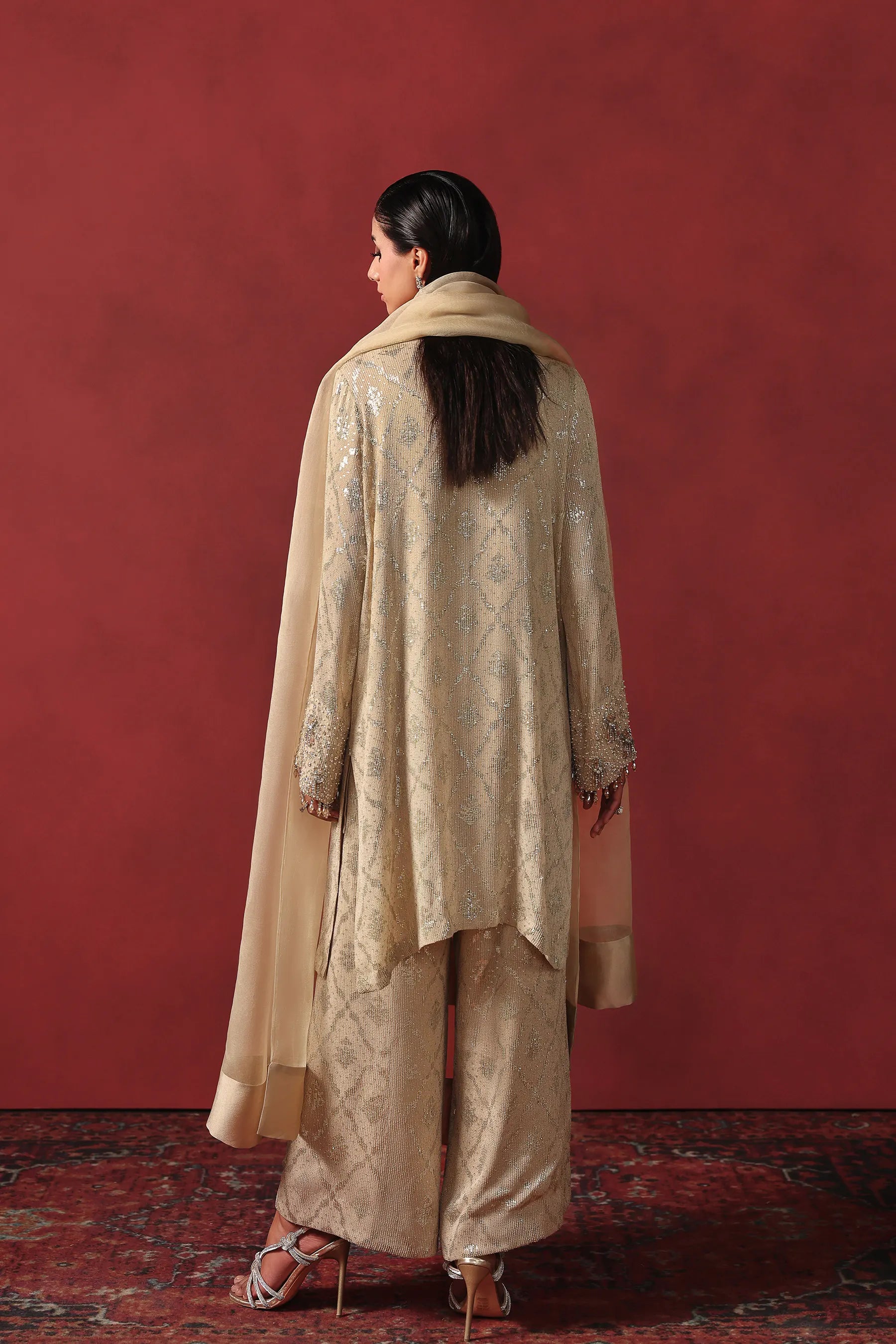 This AMMARA KHAN matching co-ord set is crafted on a champagne-gold base with a heavily embroidered sequins jaal. The straight-cut shirt features intricate hand-embellishment along the neckline and front, using pearls, crystals, sequins, and fine bead work. The full-length sleeves are finished with ornate cuffs and sewn with pearl hangings. This outfit is paired with matching wide-leg textured pants and a sheer silk organza dupatta, offering a refined and graceful look for festive or formal events.