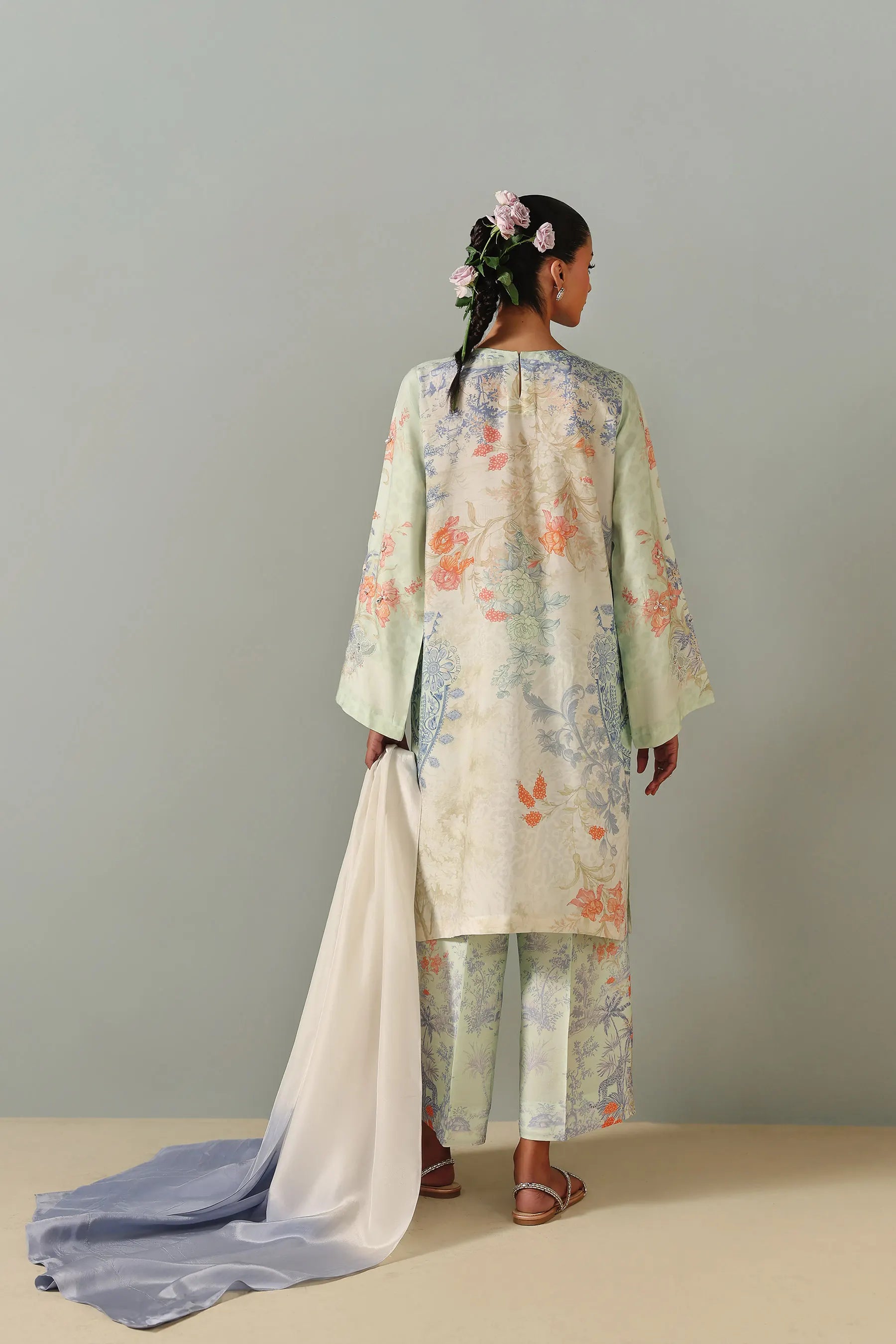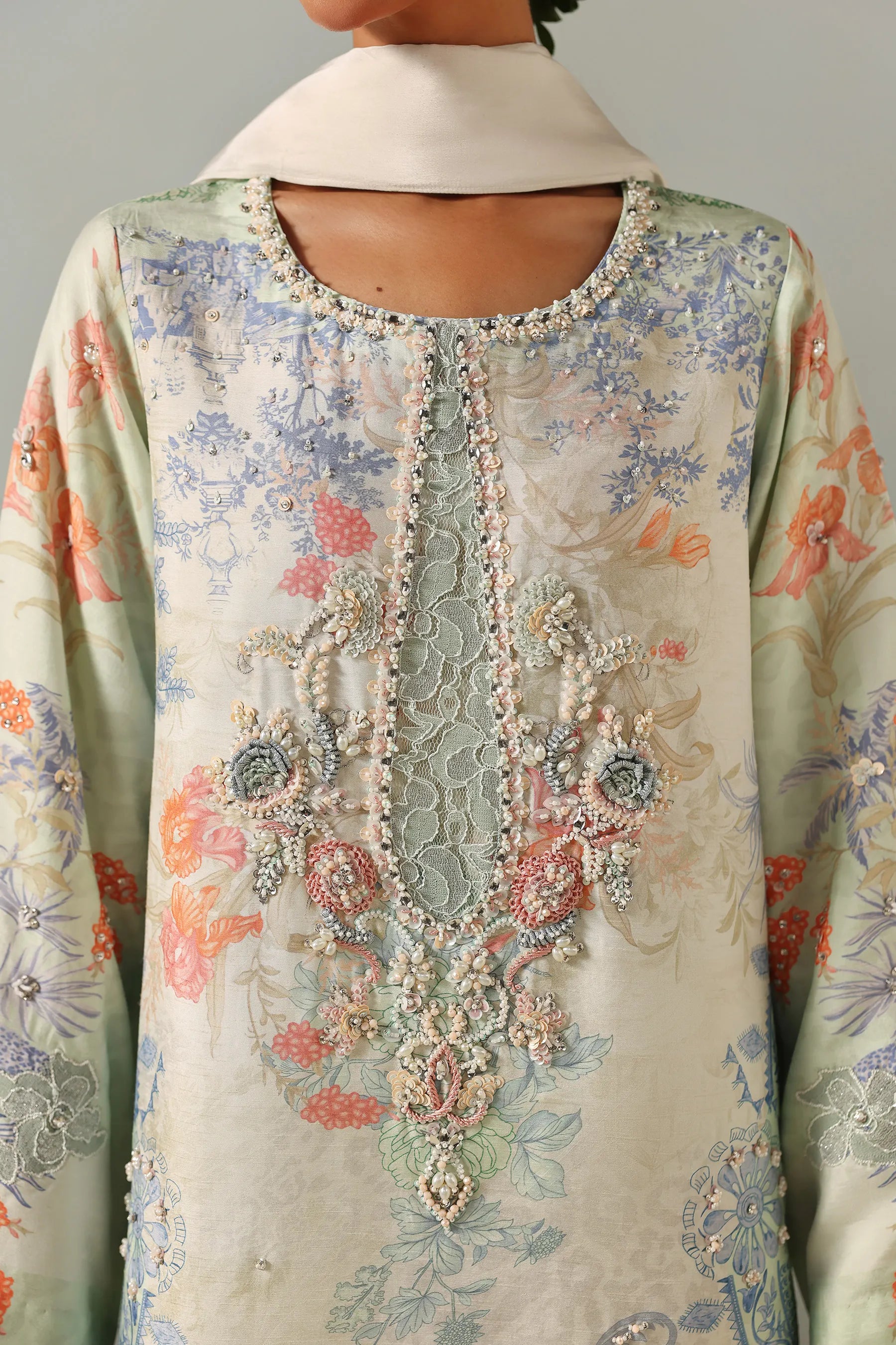 This ivory three-piece ensemble features a straight, relaxed-fit shirt with a floral and botanical print in pastel tones. The neckline is constructed with a lace applique and hand-embellished with pearls, sequins, and beads, with additional light embellishments distributed across the front. The set includes matching printed straight pants and a lightweight two-toned dupatta, that adds a soft, graceful contrast.